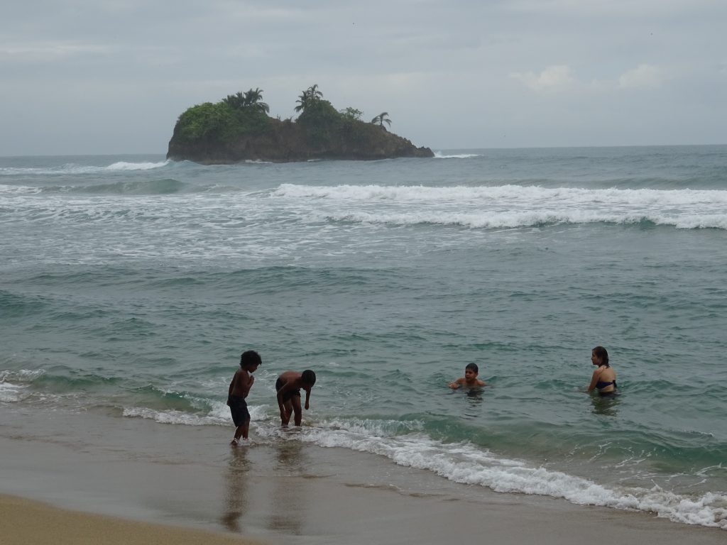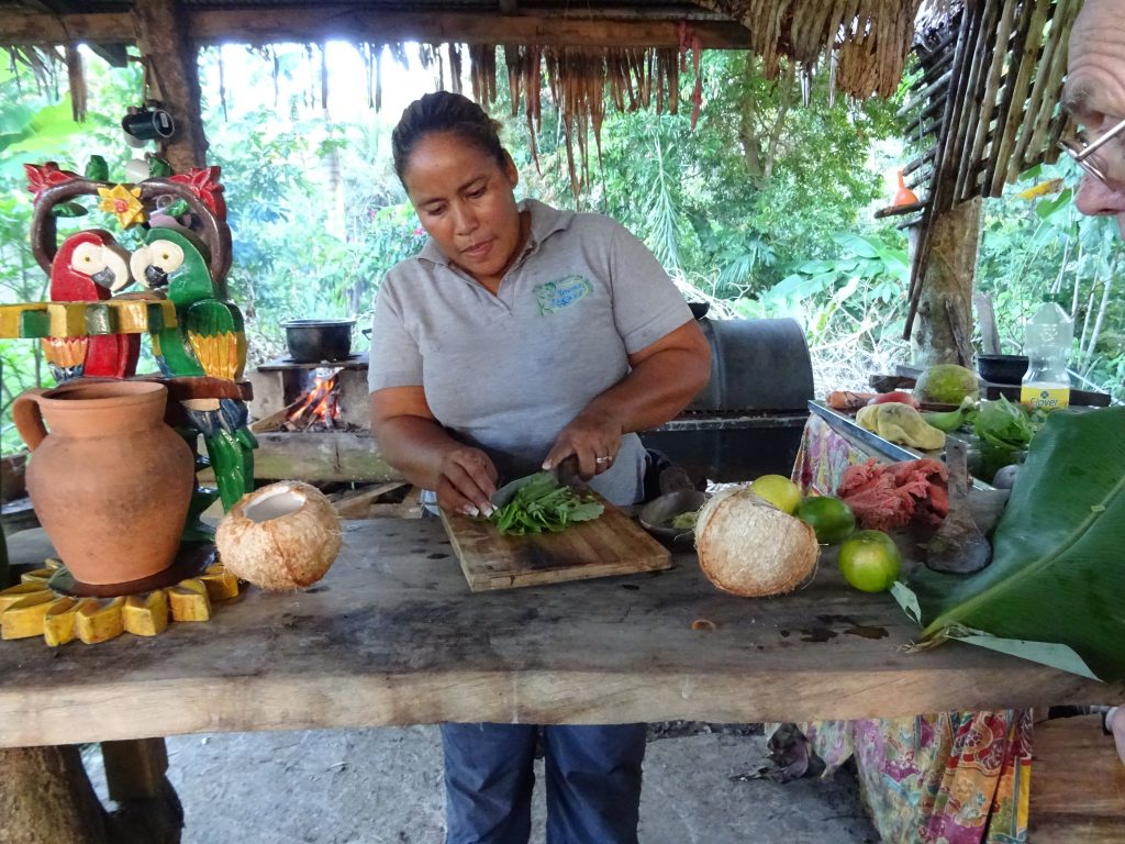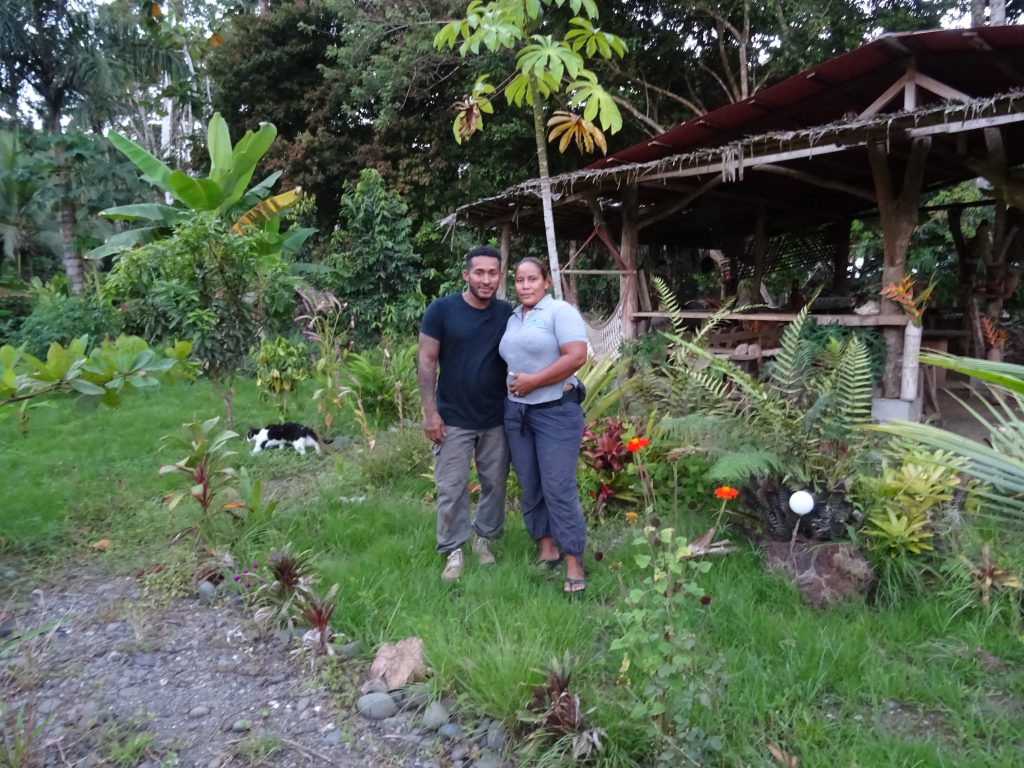After we got ourselves decent again, we went with Jacky and her husband Giovanni (strange for a Costa Rican to have an Italian name…) to their home for a cookery lesson and dinner. Their garden is full of interesting plants; she picked some herbs to go into our dinner. It was an interesting combination of vegetables and roots: manioc, carrots, bread fruit, niam, tomatoes, fried bananas and avocado. And coconut water to drink, directly from a coconut. A delicious meal. During the preparation we learnt a lot about how indigenous culture and land is under threat and racial discrimination in jobs. Children are obliged to go to school.