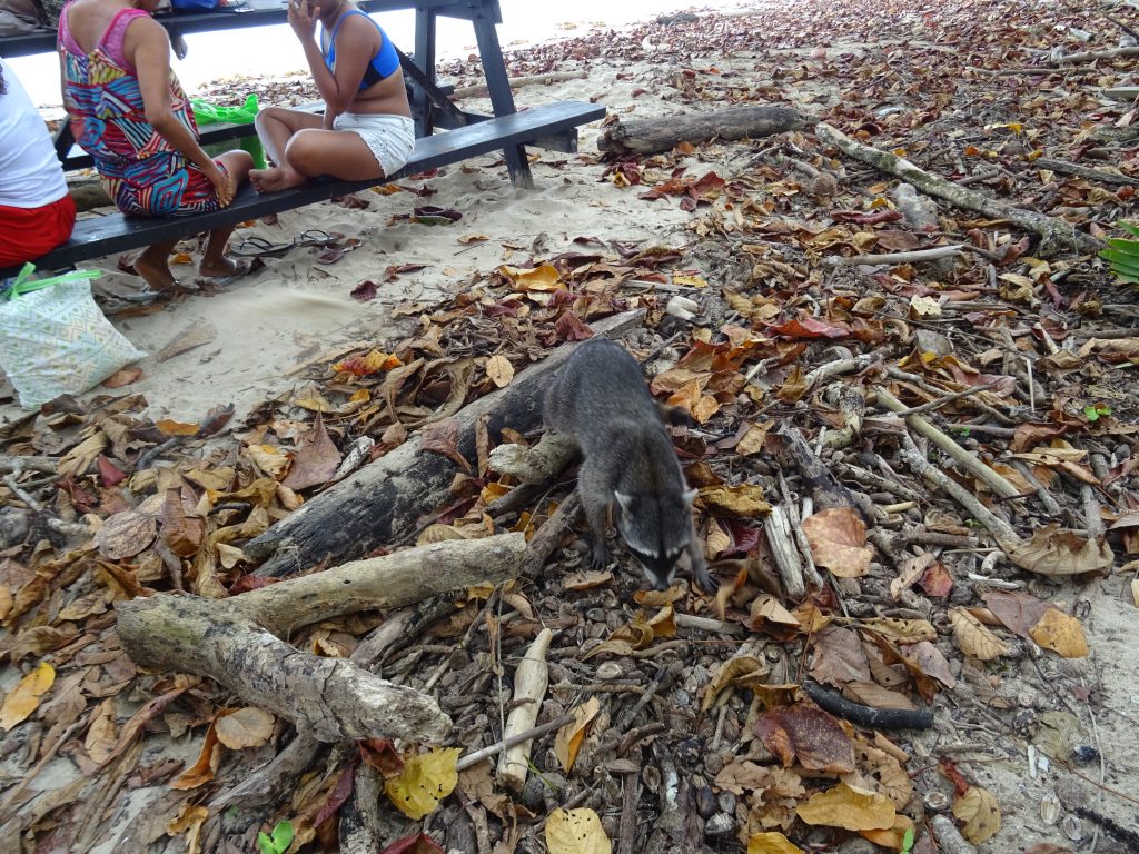 Early breakfast at 7.30am and waiting for Jacky (of Jacky’s Tours) at 8am. At nearly 9am, after a couple of phone calls from a reluctant receptionist, Jacky turned up (we are in Latin America, let’s not forget…). It turns out that there was an accident on the road – a woman runner was injured by a car during a triathlon. Anyway, we drove to Cahuita National Park which is along the sea and occupies 10 square km. Jacky is very knowledgeable about plants and animals and especially indigenous natural medicines and remedies. She is Bribri (mother Bribri and father African Caribbean). We saw monkeys, bats, a yellow snake curled up on a tree branch, a colibri (hummingbird), a racoon and a few sloths (perezosos). Short walk but nice.