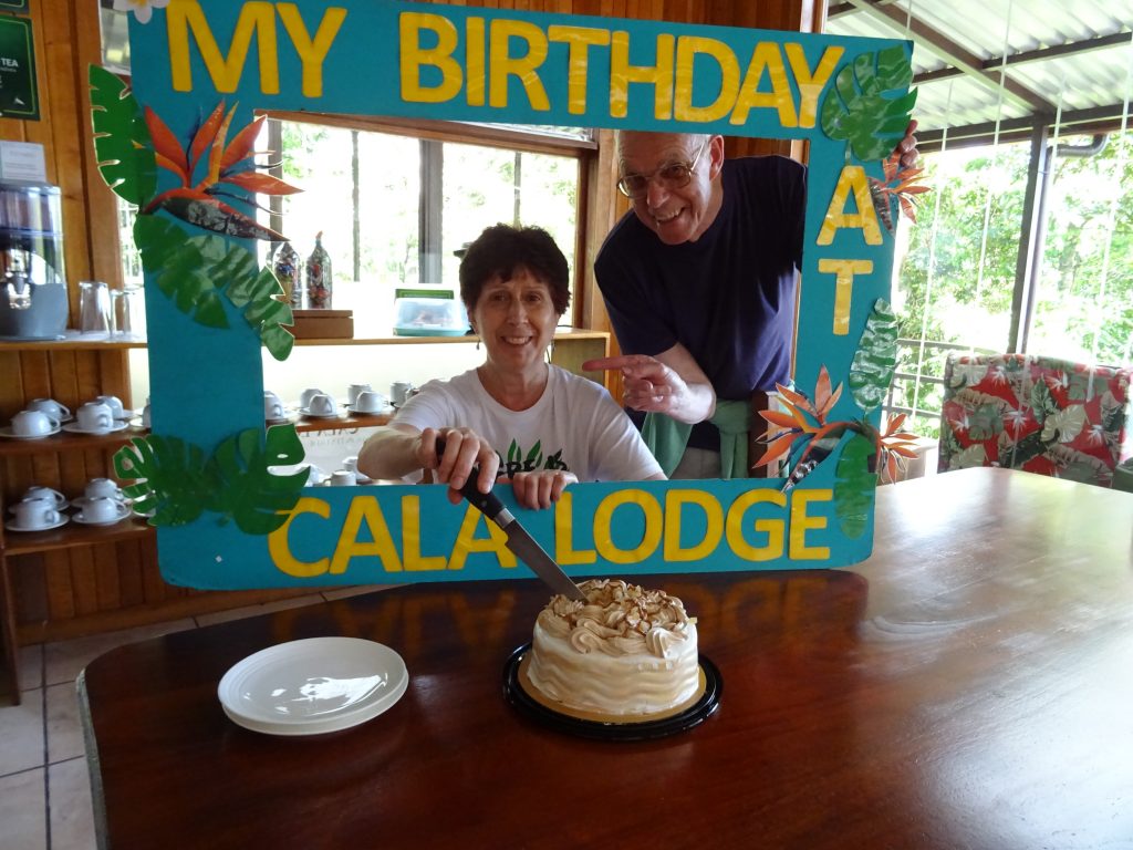 We arrived at Cala Lodge at around 12 noon and I had a very pleasant surprise: a birthday cake in our room, plus a little bar of soap, handmade locally. We settled in and then went to visit a butterfly garden (18,000 colones, dear, but well worth it). The guide, Avril, a Canadian, was very good. She started off by showing us cockroaches and insects, then we went to various netted enclosures where beautiful butterflies were flapping around.