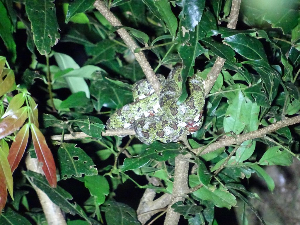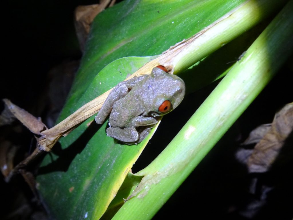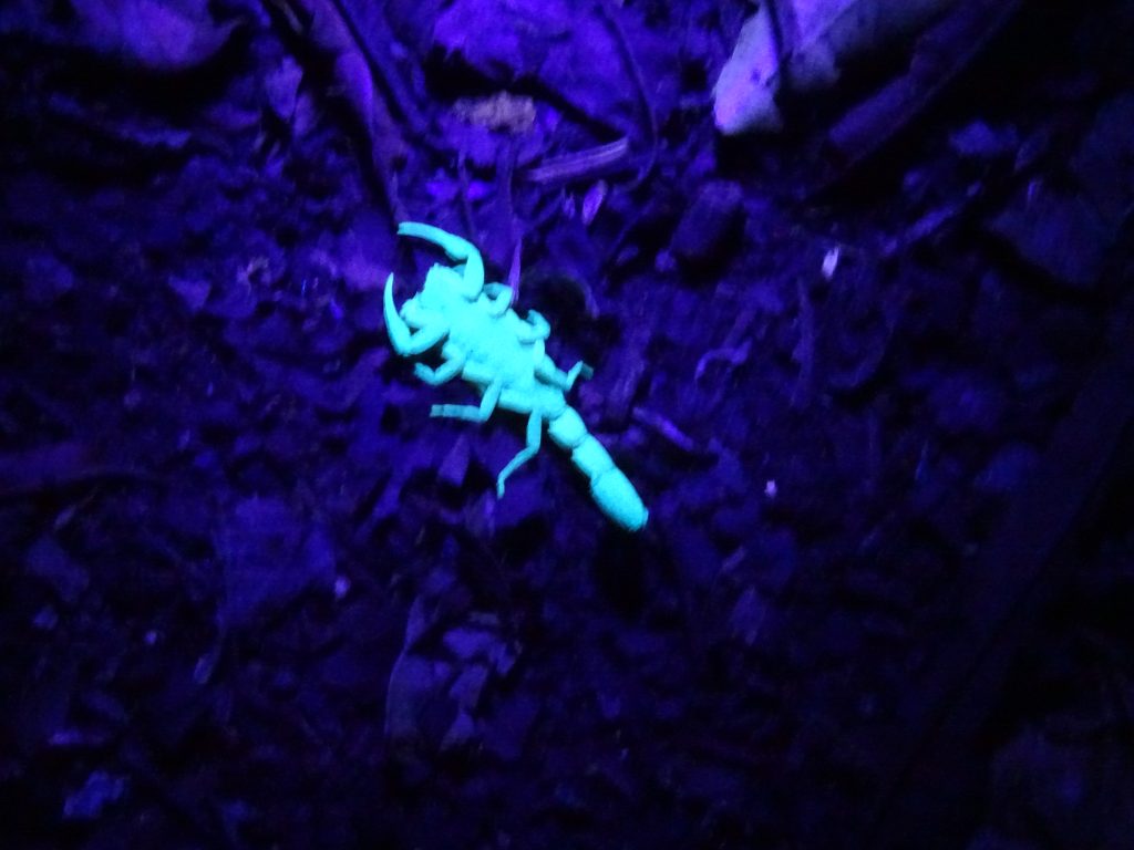 At 5.30pm we went on a night walk to the private reserve Kinkajou, about 10 of us of various nationalities. Our guide Bernie knew exactly where to look for the many creatures hiding in the darkness: we saw a sloth, a tarantula, a jay, a snake, a scorpion, various birds, some asleep with their beak under their wing, a hummingbird in its nest. He guided us to a clearing in the forest where we saw an amazing sky full of stars above us.