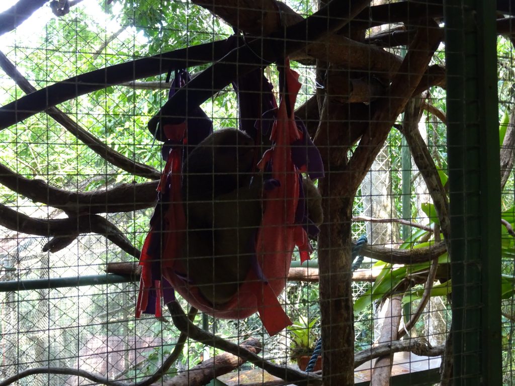 After a typical Costarican breakfast with gallo pinto (painted cockerel) – rice and black beans – fresh fruit, toast and coffee we were picked up by taxi to go to Kids Fighting for he Rainforest rescue centre. We drove through a large plantation of palm oil trees. There we were met by an American man called Chip. The project was started 30 years ago by two nine year old girls who raised money to plant trees by selling painted stones. There is now an area of land where animals are rescued, fed and some of them are released back into the wild. Some of them were kept as pets, so they are no longer used to being with their own kind. Now they live in netted enclosures: marmosets, capuchin monkeys, a beautiful colourful macaw (with a damaged beak) a lizard and many birds. Our young guide, Sierra, was from North Carolina. We both found the whole experience really sad, seeing these poor animals and learning how they were mistreated by humans.