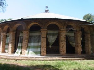It’s Barry’s 70th birthday! Today we visited two monasteries on Lake Tana: first Narga Selassie and then URA Kidane Mehret on a peninsula. Both very impressive places, with paintings of stories from the Bible (both Old and New Testament) on the walls. We had a very thorough introduction and explanation of the various “scenes” from Gebre. The Ethiopian Bible is more detailed than the Western version, for example in the story of Mary and Joseph’s flight to Egypt they tell of where the stayed in Egypt.