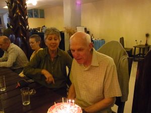 We tasted some and it was delicious. We went through a couple of villages that had houses built from trunks of eucalyptus trees (the walls), covered with mud and cowdung, some of them painted in bright colours. They last about five years and then they have to be rebuilt. Children waving as our bus was passing. We bought two beautiful cotton scarves, one green, one red. At the end of the walk we crossed the river in a tiny boat and walked back to the bus. We went for lunch to a nice restaurant overlooking the lake I had injera with a bean sauce and Barry had spaghetti (which was overcooked and cut up in short bits – aargh!) Then off to the market and finally to a panoramic point to look over the town. On the way we passed a monument commemorating the victims of the DERG. Dinner at the hotel with a special cake to celebrate Susan’s birthday.
