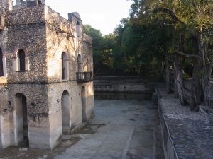 At the bathhouse of Fasilides Ethiopians celebrate the festival of Timkat (18-20 January) each year. It is attended by thousands of people, priests in their colourful robes, the pool is filled with water and people jump in it.