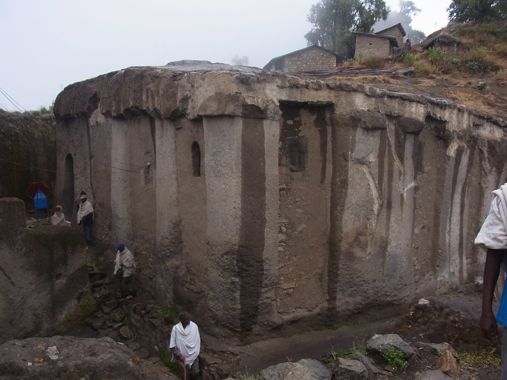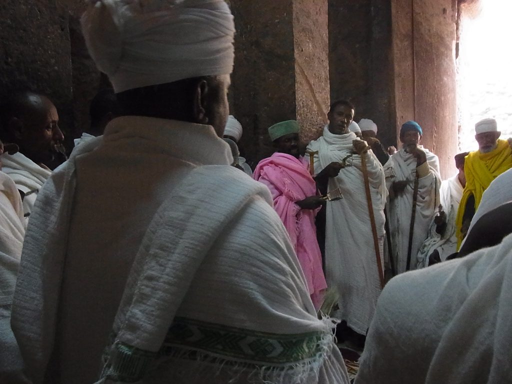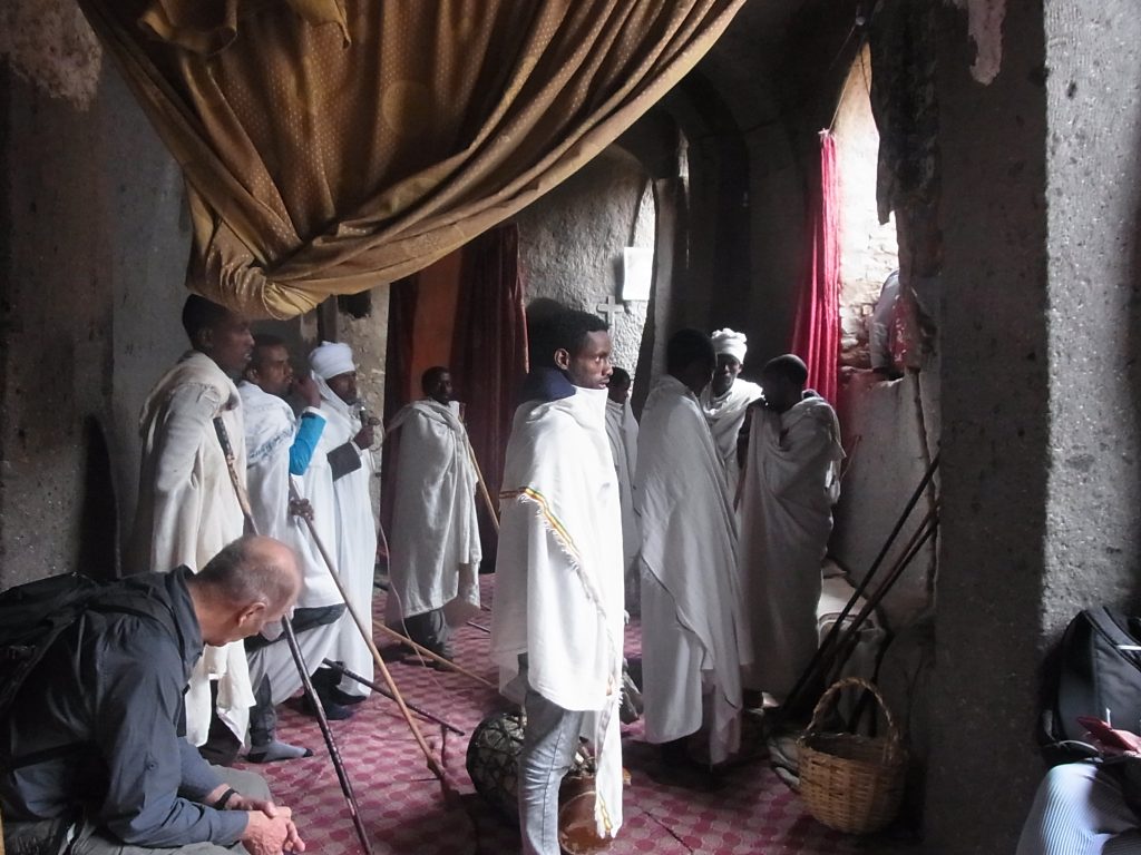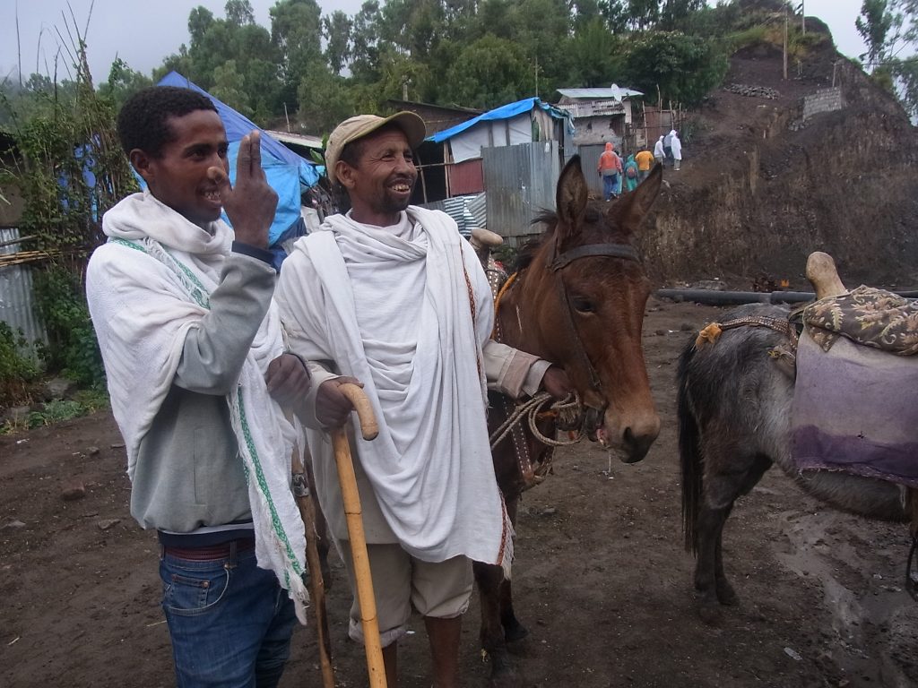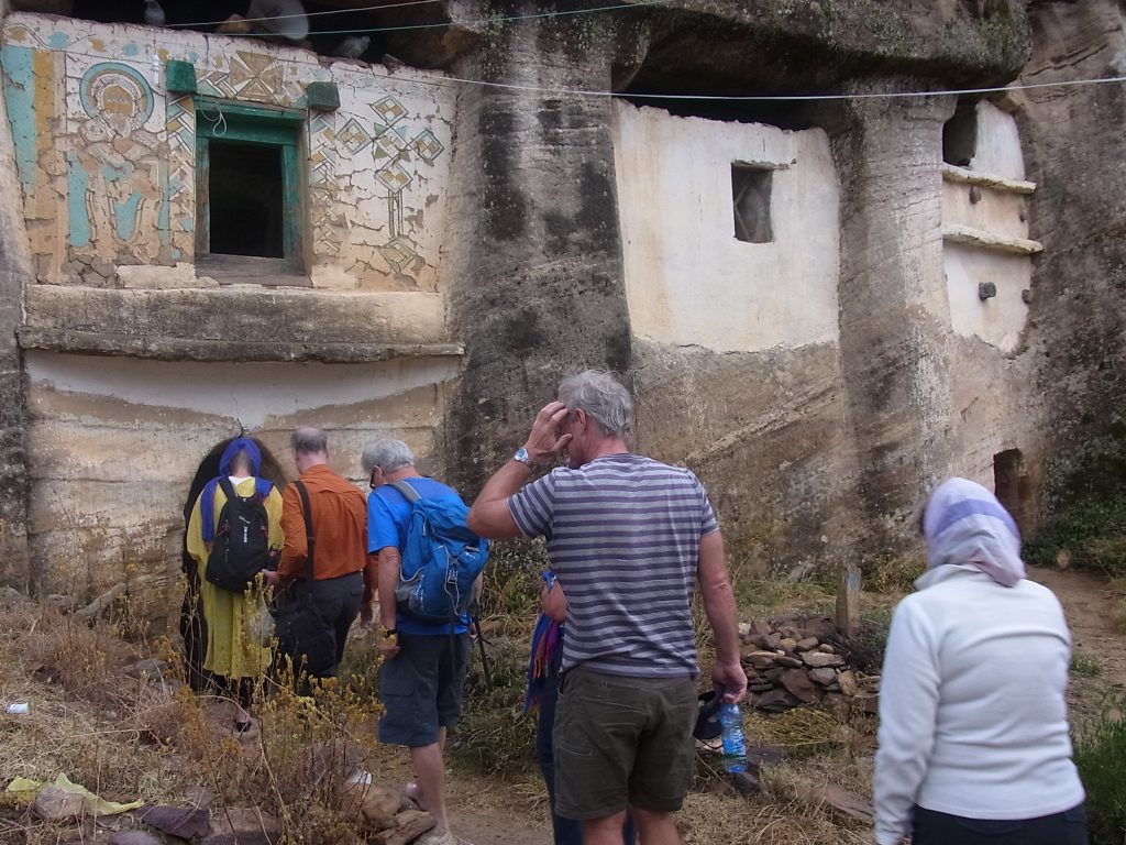 We walked for one bit of the way and reached Ashatan Mariam Monastery through a dark tunnel. We are at nearly 4,000 metres. The monastery is carved in the rock; we took our shoes off and got our socks wet. Beautiful simple interior, small. A priest showed us some of the treasures: a bronze cross (heavy!) books and wooden crosses. Across the church a group of priests was chanting. On the way down we stopped for a coffee break and then back on the mule for the descent. Misty, so no views, but an unforgettable experience – and a sore bottom!