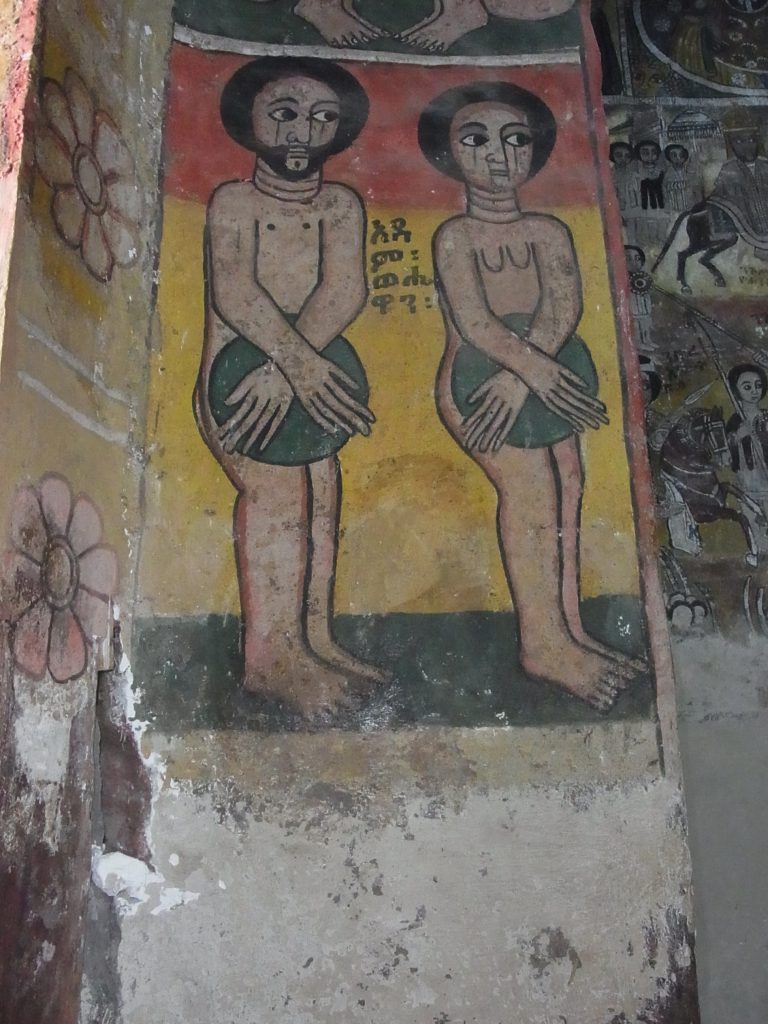 In the morning we visited two more rock hewn churches: the famous Abreha Wo Absebeha (two brothers who were saints) and Wukro Cherkos, on the northern outskirts of the town. On the way to the first church the road was difficult as the bus was getting bogged down in mud as it had rained the night before, but our driver Tariku was brilliant and we managed to get there! Another example of beautiful church carved in the rock face and with frescos on the walls, saints, Madonna, Adam and Eve, etc.