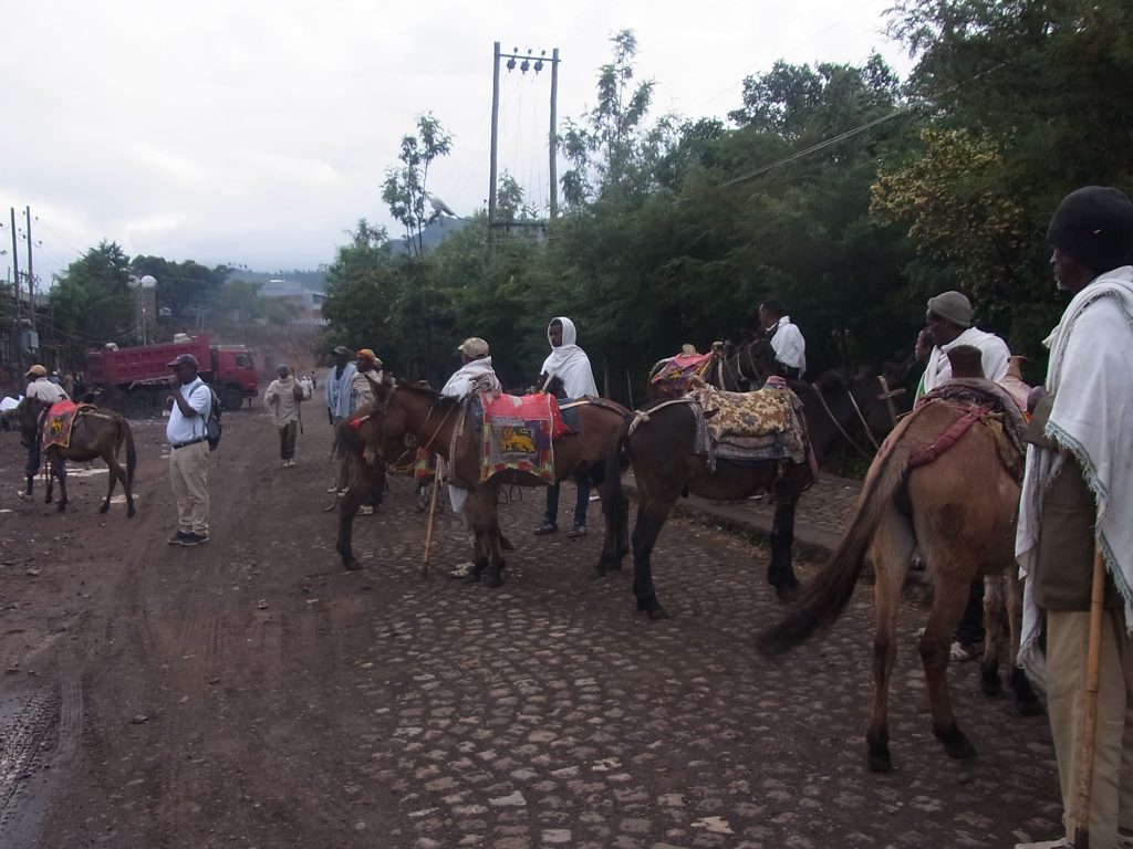 We started at 7am (early start to avoid the heat, but today we have a drizzly rain) with the mules waiting for us outside the hotel. A coordinator pointed at each of us as he chose the appropriate mule. My mule is called Desta and he was very good, no bumping around or running close to the edge of the path. Quite a challenge, especially as the ground was muddy.